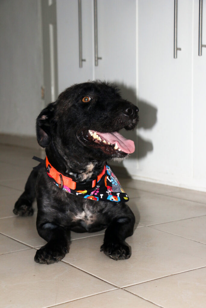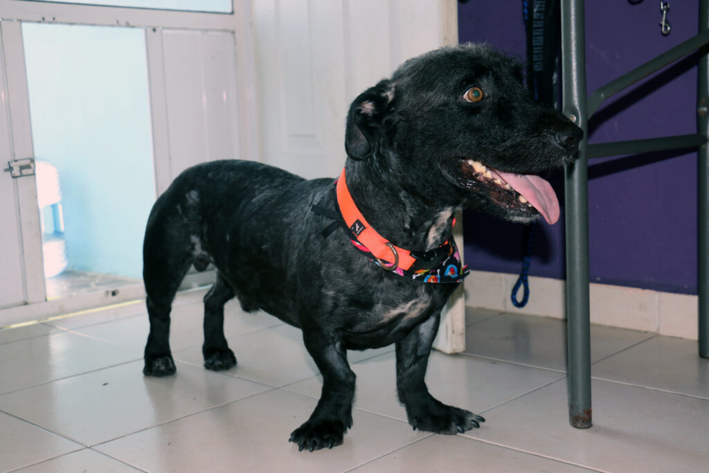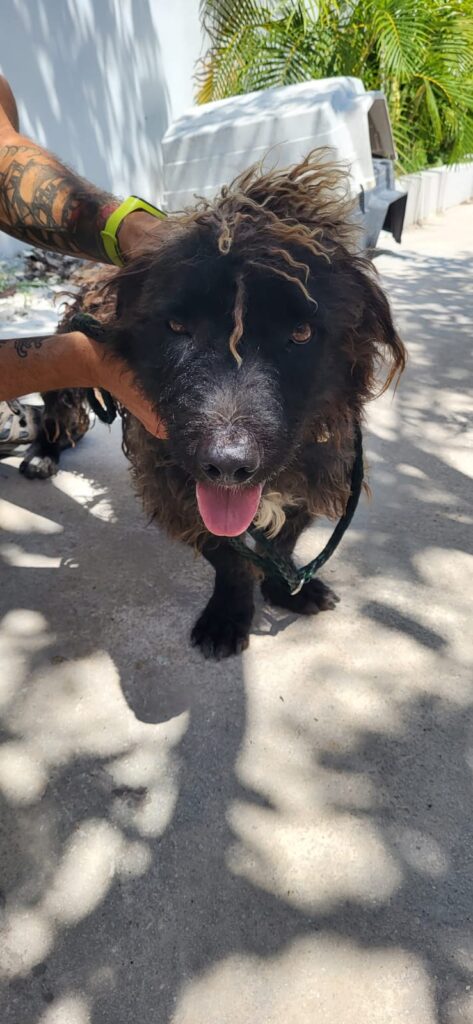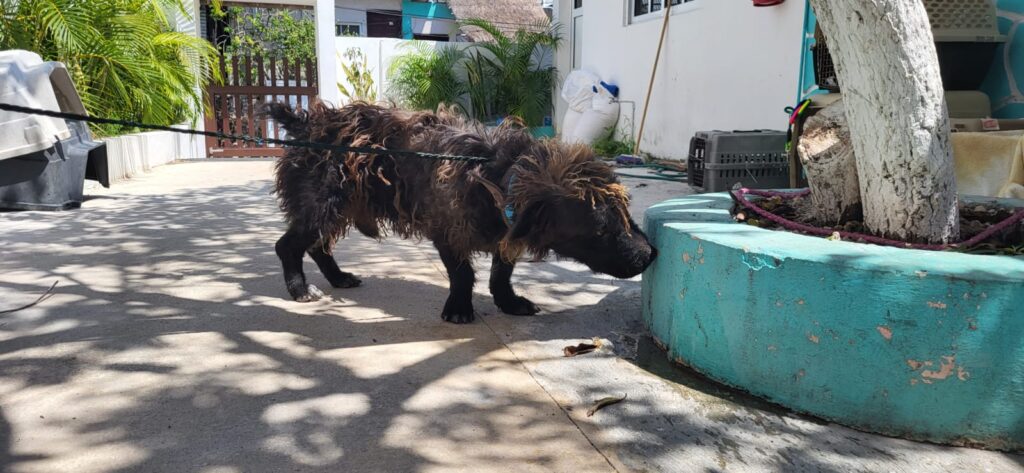 When we got him in, he had the funniest dreadlocks, and as usual, we shaved him to give him a fresh start, but kinda hoping those come back again and he looked even more unique! We have no idea what he is, he is long and short as a dachshund, with super strong legs but he’s so short he can’t really jump on things much. He’s also pretty heave at more than 40 pounds.