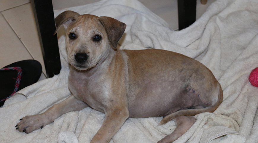 Hughie and his 3 siblings were rescued from Rancho Viejo. Hughie was hit by a car and suffered a terrible leg / hip break. Our amazing vet amputated the broken leg and now Hughie gets around just fine on 3 legs and pain free!