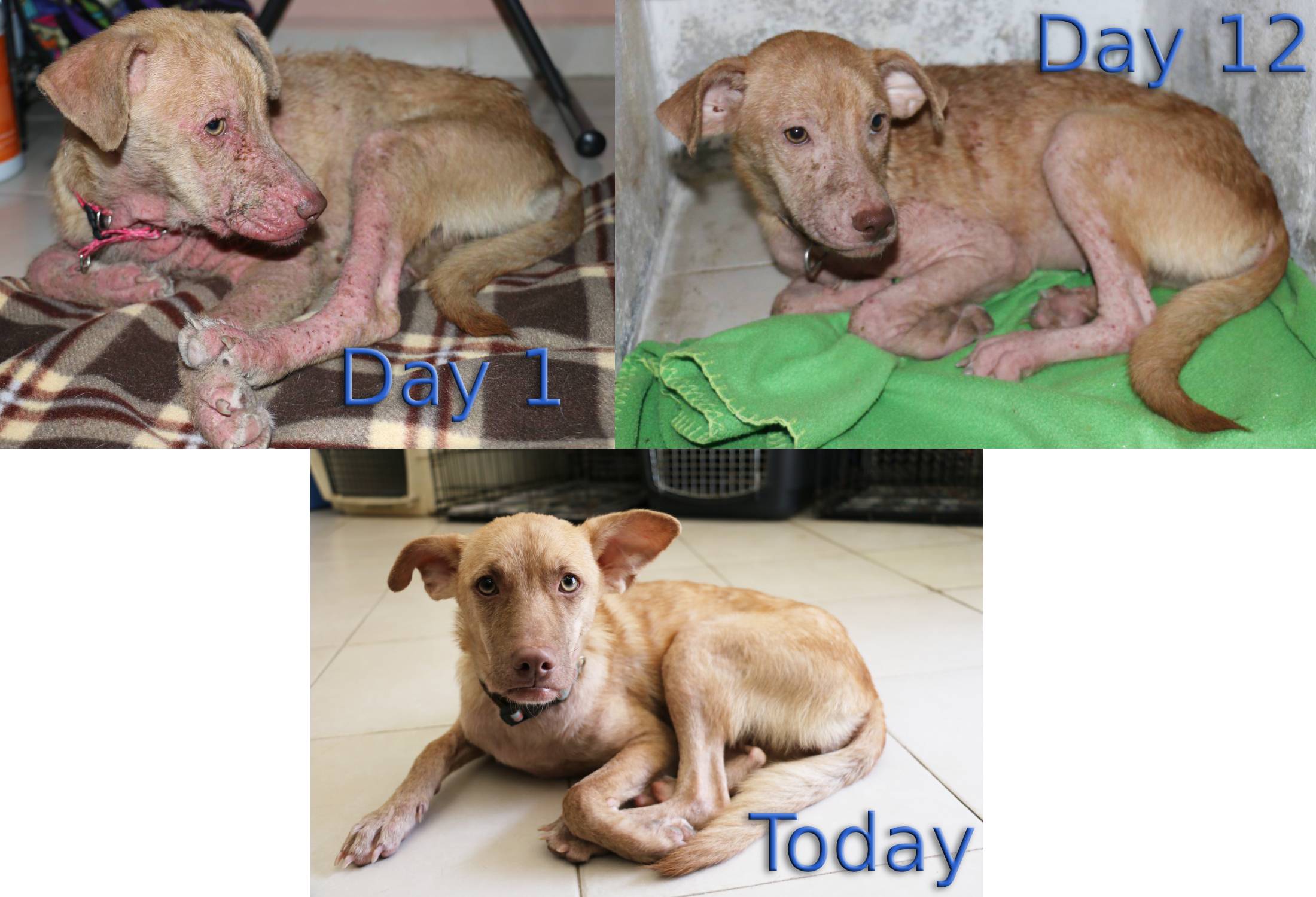 Katie was cast off in the streets of Isla to fend for herself. She was scared, hungry, covered with sores and scabs. She possibly had been hit by a car at one time in her life as she had a wounded back foot. It took her a while to realize that everyone at Isla Animals just wanted to help and love her. Trust was earned and her recovery is coming along beautifully as you can see in the photos below. The photos show what medicine, special baths and lots of love can achieve. Katie has won the Isla lottery and she knows it!! She has all her shots, has been spayed and is looking for her fur-ever home. Stop in and see this beautiful girl at Isla Animals located at the large palapa near the Island Hospital. You will not regret it!!
