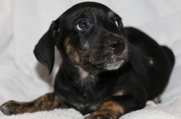 Libra, her sister Aqua and her three brothers, Leo, Capi, and Taurus were living on their own in a jungle garbage dump. The mother weaned them but was around the area and we were able to capture her and get her spayed. Libra’s legs have a brindle color on them to make her extra distinct. The puppies are in foster care, growing, thriving, and their personalities are really coming out. Libra and her siblings will soon be ready for their fur-ever home.