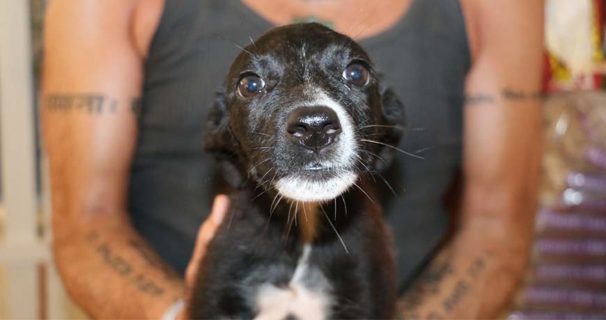 Meadow is a playful puppy, a bit shy at first, but full of love to give. She’s all black with a white spot on her nose and white on her chest (if you look closely it even looks like the shape of Isla Mujeres!)