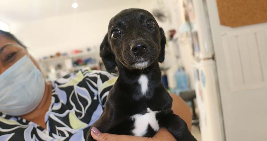 With lots of love and daily baths, she’s getting so much better! She’s a curious little thing and loves her food, so come by Mundaca to give her a treat and enjoy a puppy cuddle!