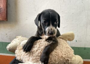 We got a report of a high pregnant dog, Willow. The day we went to check on her she gave birth to her 9 puppies in a small jungle part full of trash. Those days it was raining so much that it was no question we had to take them with us. As we really struggle with space we were grateful that we found a foster home. 6 weeks later they came now to the temporary shelter on the island. Pine and her siblings got their first vaccine, soon we will spay and neuter the 9 so they can go to their forever homes.