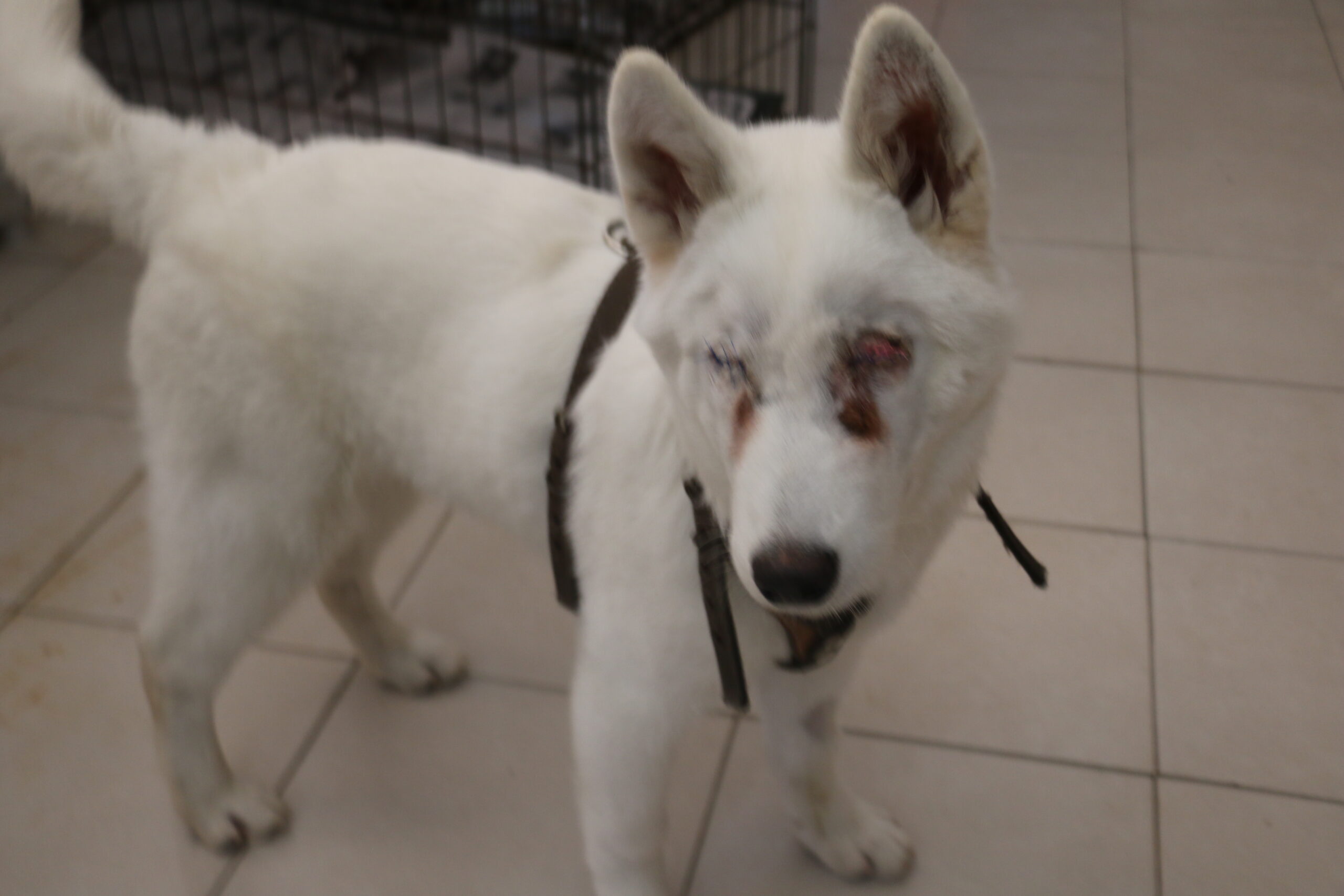 Titan is a young dog, approx 5-6 months old. He was blinded by a disease when younger and had to have both eyes removed. He has recovered completely and you would never guess he was blind! He can understand new environments quickly as his other sense have become more acute. Truly an intelligent and loving puppy, Titan will make a wonderful addition to the right family.