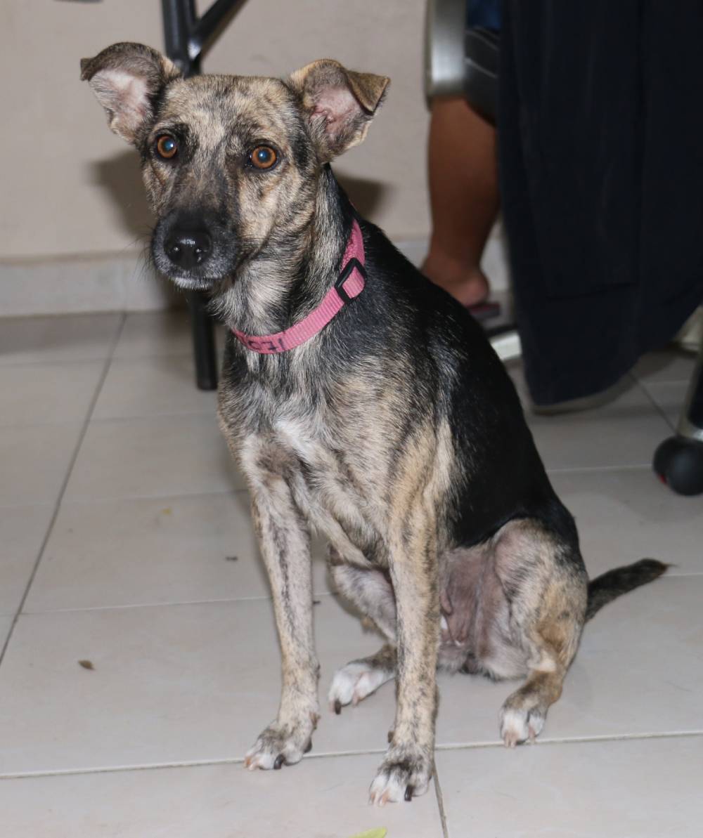 Here is a photo of his mama Vida. She is very small, very sweet, does not bark, and gets along great with other dogs and cats.