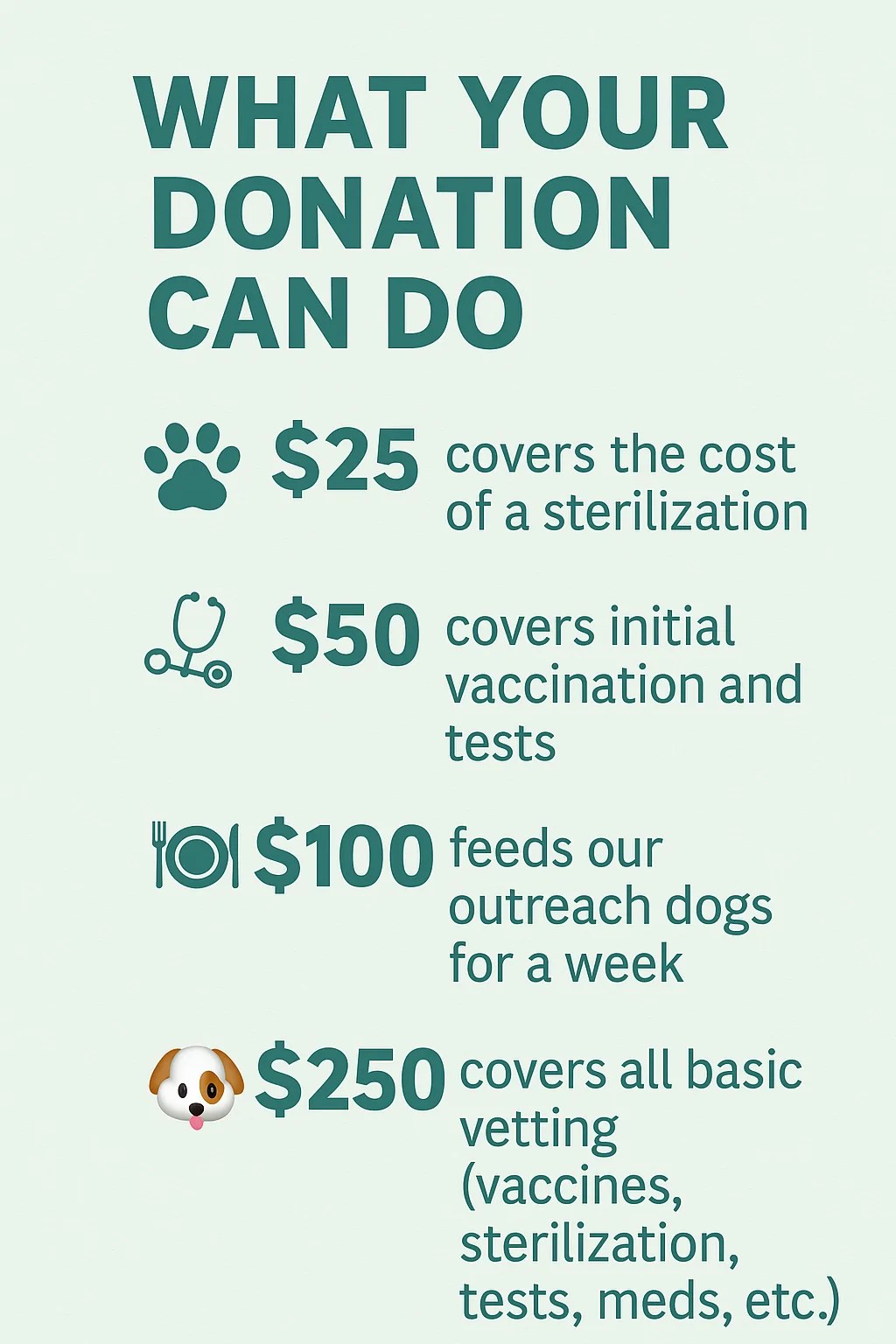 Isla Animals runs 100% on donations from kind-hearted people like you. Whether it’s $10 or $1000, your support means food, medical care, sterilization, and a second chance for dogs who have no one else.
